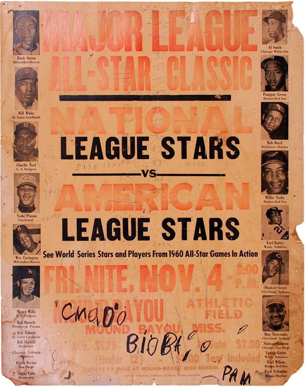 Great images of Africa American All-Stars of Major League baseball adorn this 1960 poster advertising an off-season barnstorming game. 22 x 28" poster has photos of Aaron, Covington, Wills, Grant, Newcombe and more. Poster has missing corners, chips off the edges, spotting and writing overall in pencil and in black marker along the bottom. This classic poster has great character regardless and the images are priceless.