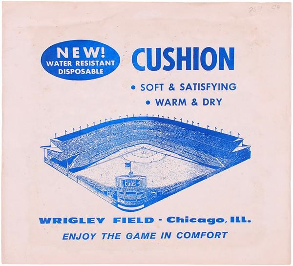 Relic from one of the all-time classic parks in baseball. This seat cushion comes from Wrigley Field circa the 1960's. This clever, disposable seat cushion was sold to fans seeking relief from the cold, wet stadium seats. The paper has slight toning and spots, but looks pretty much as it did when it was purchased. EX/NM