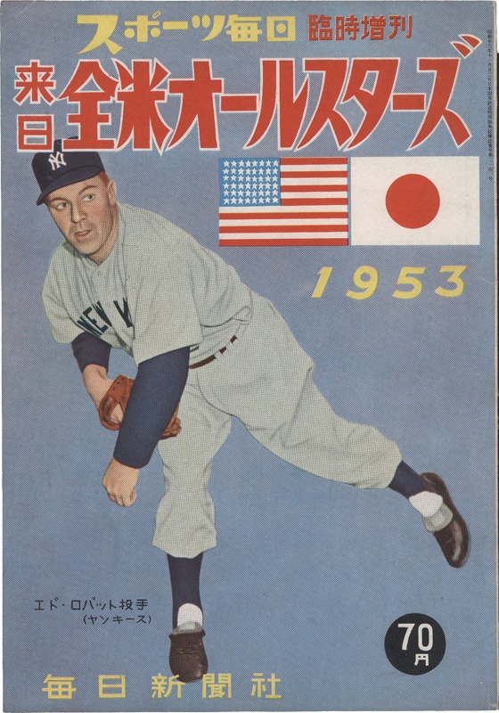 Fine souvenir program from Ed Lopat's All-Star tour of Japan in 1953. Cover features nice, colorized image of the Yankee hurler. Script is in Japanese and the program reads right to left. Overall in EX/NM condition with good glossy cover, little wear to the spine and no holes or tears. Fantastic photos of the eras best players inside.