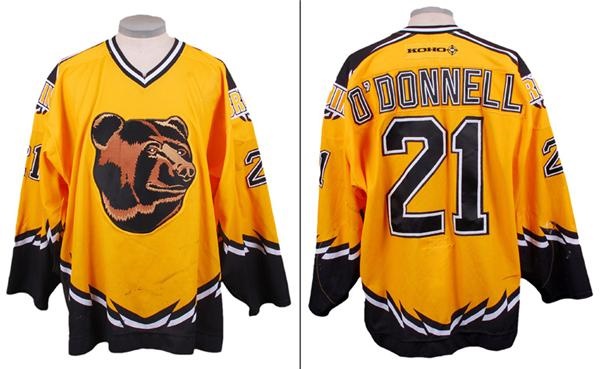 Alternate, #21 Bruins jersey (KOHO size 56) worn by O’Donnell in the 2001-02 season with a letter of authenticity from the Bruins. There is a team stamp behind the Bruin logo on the inside of the jersey. It shows great use with tears on both sleeves and very nice stick marks along the bottom.