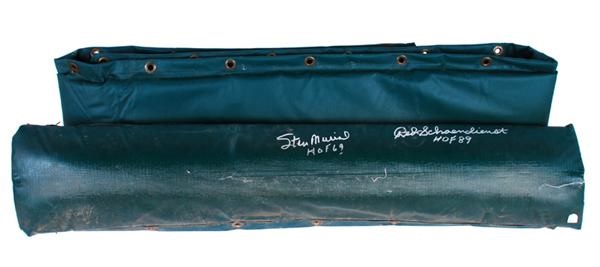 Two green rail pads used at Old Busch Stadium have the MLB hologram affixed to each and were obtained directly from the St. Louis Cardinals. To make matters better, they were both signed (in person) by Stan Musial. One was also signed by Red Schoendienst. Signatures in silver paint pen are 9/10.