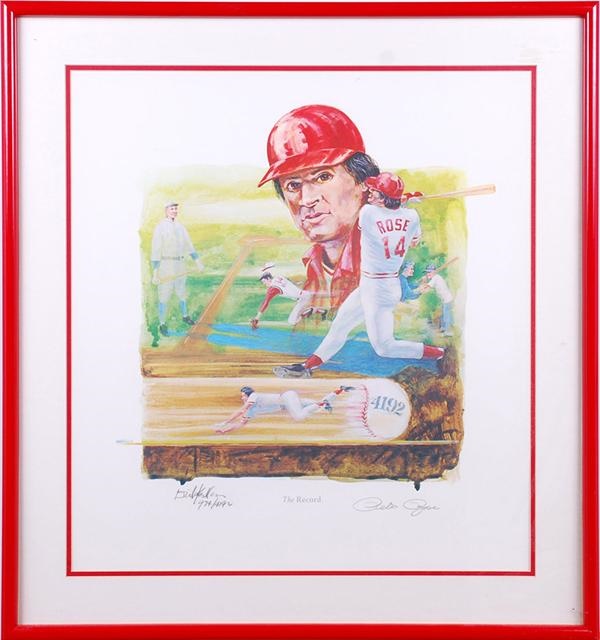 "The Record" a 28.5 x 31", framed print celebrating Pete Rose's record 4192 hits. The print has been signed by Rose and the artist. It is a limited edition 974 of 4192.
