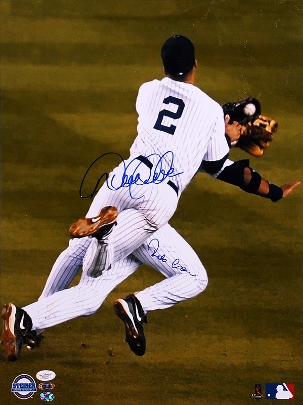 Derek Jeter diving over Robinson Cano, signed by both Yankee superstars in mint blue sharpie. JSA and Steiner COA's. Mint.