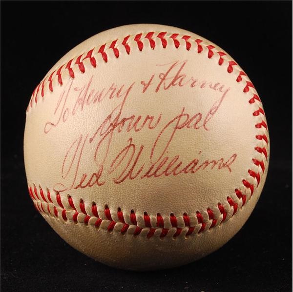 Official American League (Harridge) baseball signed by Red Sox legend Ted Williams with the inscription, "To Henry & Harney Your pal Ted Williams". The mint signature and inscription in red ball point are on a side panel of the off-white ball.