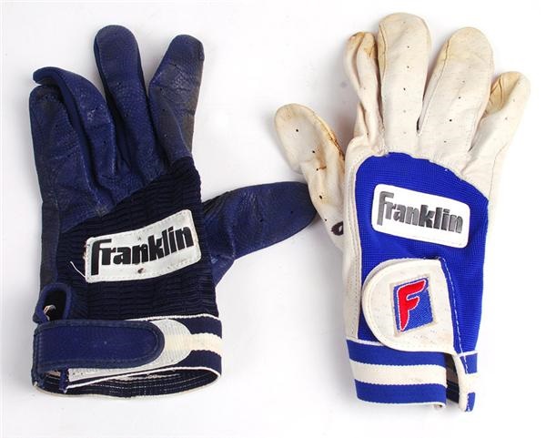 Pair of Franklin gloves. This is a mis-matched set as one is white and the other blue. Show moderate to heavy use.