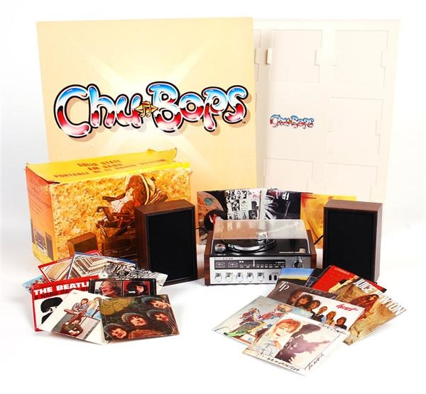 Complete set of 85 with gum removed out of 95% of the packs. Includes two original holders that hold 8 albums each and the rare Premium Radio in the original box. The box for the radio some scuffing, small tears and loose end flaps, but no missing pieces. Chu Bops packs are NM-MT (with note to missing gum).