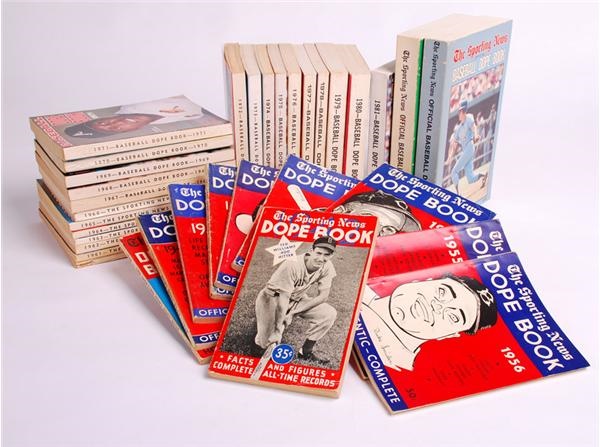 Popular and useful booklets issued annually by The Sporting News. Includes 1942 (1st year), 1948-1956, 1959, 1961-1985. Stars pictured on the covers include Ted Williams, Duke Snider, Phil Rizzuto, Willie Mays, Joe Dimaggio, Pete Rose, Mickey Mantle and more. Conditions range from VG to Near Mint with most Excellent or better.