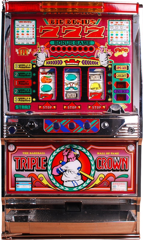 "Triple Crown" Modern slot machine features likeness of the great Babe Ruth (wearing #3). 19 x 32 x 11''. In working order but needs a new key. Takes tokens. EX. Due to the size/weight of this item shipping will be substantial, it is also available for pick up at our Cape Cod office.