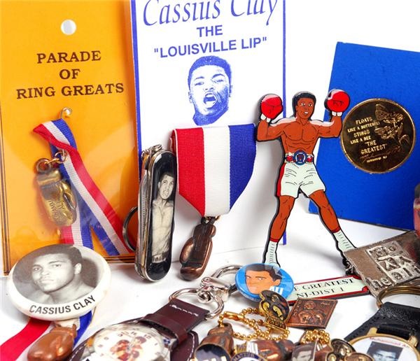 Huge assortment of boxing pins, charms and key chains celebrating "The Greatest ", Muhammad Ali. (58) piece lot includes rare "He's the Greatest" metal tab and 1960s Cassius Clay Celluloid pin with charms. Also, vintage pinback buttons, stick pins, commemorative coins, boxing glove charms, a dog tag, mini leather glove key chains to name a few. Condition ranges from VG to MT.