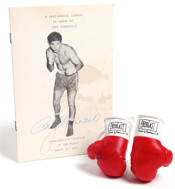 Testimonial Dinner Program in Honor of Joey Giardello signed by Rocky Marciano on March 21, 1964 in mint blue ballpoint. Also in this lot is a pair of mini gloves signed by Jake La Motta (signature "7" on scale of 1-10).