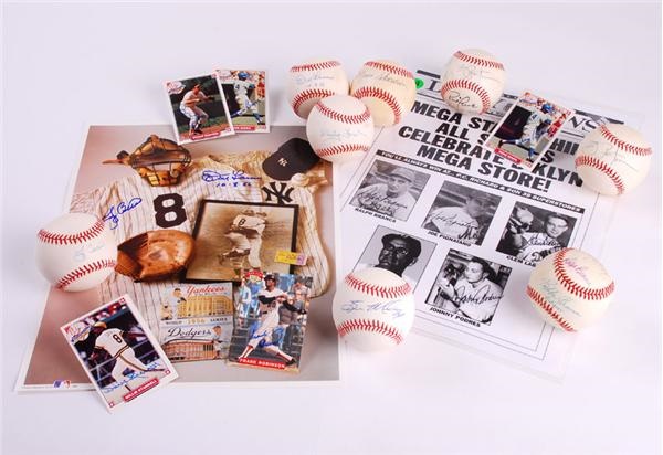Includes Single Signed Baseballs: Whitey Ford, Yogi Berra, Bill Skowron, Don Larsen (dated Perfect Game). Baseball Signed by Thomson, Branca, Podres, Labine, Clyde King and Pignatanto. Baseball Signed by an assortment of 10 players including Craig Nettles, Joel Youngblood, Joe Pepitone, Ed Kranepool and more. Nabisco Baseball cards signed by Ernie Banks (2), Brooks Robinson, Willie Stargell and Frank Robinson. 1956 Perfect Game Print signed by Yogi Berra and Don Larsen. Finally a Daily News 11 x 14'' poster signed by Ralph Branca, Joe Pignatano, Clem Labine, Clyde King and Johnny Podres. EX-MT to Mint.