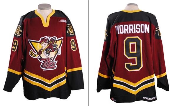 Bauer size 56. Plenty of stick marks and very nice wear throughout including on the crest. Nameplate change, which is common in minors. Material swatch used for repair on back next to nameplate.