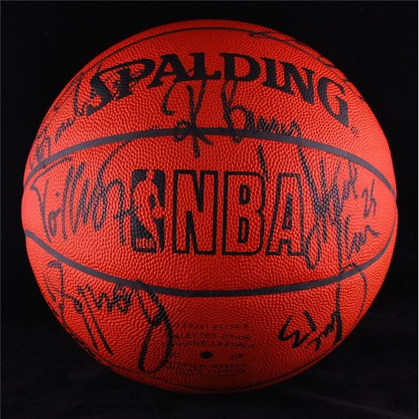 Spalding NBA ball is signed by 12 players including Michael Jordan. Special graphics identify this as a special "Repeat 3-Peat" Ball and limited edition #371 of 1998. Mint.