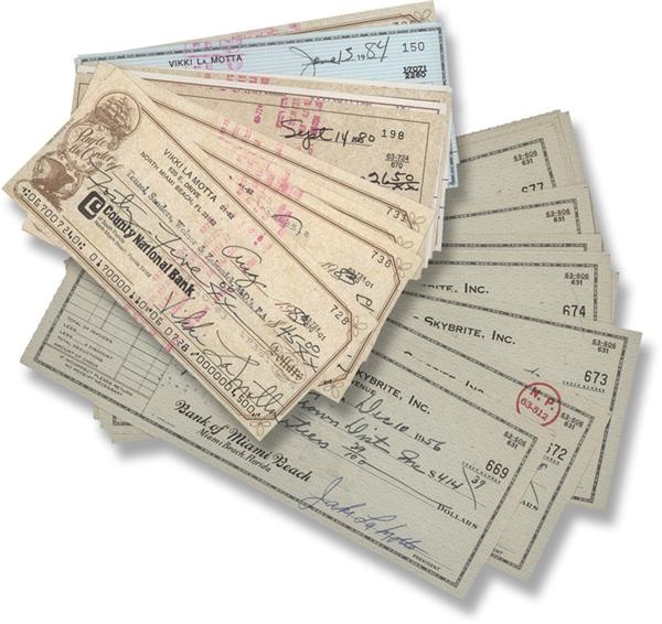Thirteen are signed by Jake Lamotta, Fifteen by Vicky. The Jake Lamotta checks all date from 1956, the Vicky Lamotta checks all date from the 1980s. Bold ink signatures. EX-MT