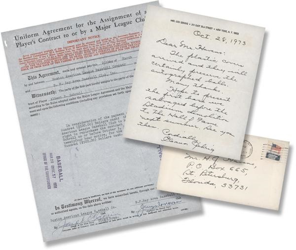 Includes Eleanor Gehrig handwritten letter dated Oct 28, 1973 with neat collector content. Mrs Gehrig discusses giving a Yankee Stadium base to the Hall of Fame and also some autographed baseballs. Includes original postal cover as well, postmarked Oct 29, 1973. The lot also includes a one page uniform player agreement sending Albert Schroll from the Red Sox to the SF Bay Area Club, signed by Hall of Famer Joe Cronin in mint blue ballpoint. Dated March 25, 1956. EX-MT.