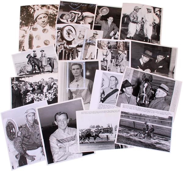 Great lot of Horse Racing Photographs including multiples of Jockies such as James Jones, Silvio Coucci, Steve Donoghue, HW Fischer, Jesse Davidson, Lino Burgos, Walter Blum, and more. Horses such as Nasrullah, Mongo, Pintor Lea, Ponder and more. Events such as Kentucky Derby, Pimlico, Churchill Downs and more. Many significant races are featured, Most date from 1930s-1960s. Sizes vary, overall Excellent.