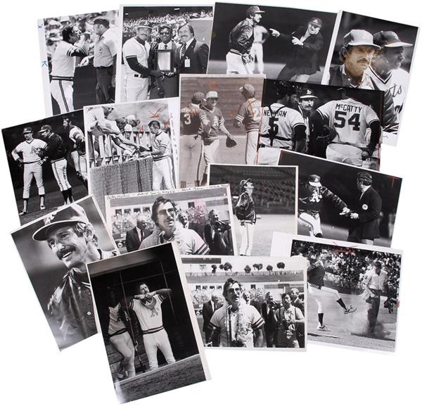 One lot of 27 photographs picturing Billy Martin as manager of the Oakland Athletics. The photos in this lot are 1st generation prints taken by members of the SFX staff. They are not available anyplace else. Several classic shots of Martin arguing with umpires, as well as accepting awards, signing autographs, and talking with players and fans. Most are about 8 x 10'' or slightly larger. EX-MT