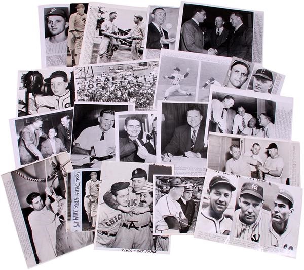Large lot of ninty-eight photographs picturing members of the Chicago White Sox from the 1930s-1960s. Most picture players out of uniform enjoying the off-season, but several picture the player in uniform. Some players include Jimmy Dykes, Bob Nicholson, Ted Lyons, Ferris Fain, Early Wynn and more. Sizes vary. VG to EX.