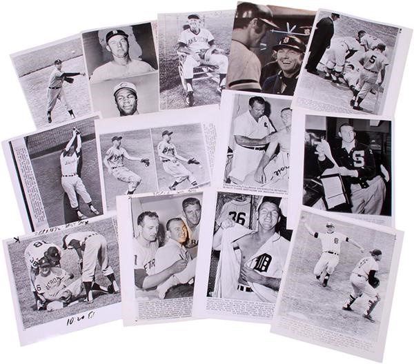 Fine collection of forty-seven photographs picturing Hall of Famer Al Kaline during his career. They date from 1956-1974. Kaline is pictured hitting, diving for the ball, playing the field, laying on the ground after getting beaned, with fellow teammates, with Frank Robinson, with Leo Durocher and more. About 7 x 9 to 8 x 11''. EX/EX+.