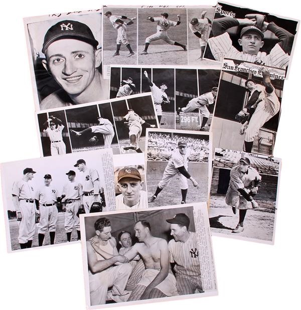 Collection of Atley Donald wire photographs (11). Donald was a NY Yankee pitcher from 1938 thru 1945. In 1939 as a rookie he won his first 12 games and finished the season 13-3. Original photos are 3" x 7" to 8" x 11 1/2" in size, VG-NRMT condition. A photo from July, 1941, "Donald Puts the Hex on that Feller" shows Donald pitching during a 4-3 Yankee victory over Bob Feller and the Indians. Another shows Donald "grinning" after a pennant clinching victory over the Boston Red Sox in early September, 1941. The Yankees went on the defeat the Brooklyn Dodgers in the World Series that year in five games.