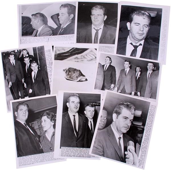 Photos of the second most infamous kidnapping in American history, to that of the Lindbergh baby. The (9) wire photos measure 8" x 10" and are in NRMT condition with some newspaper edits. Frank Sinatra Jr. was 19 years of age when he was snatched from his hotel room at the Harrah's Lake Tahoe in December, 1963. His father paid the $240,000 ransom and Frank Jr. was released 2 days later. All three kidnappers were arrested shortly thereafter and convicted to life sentences. Photos show all three kidnappers as well as a close up of a gold ring with the initials FS, which was found on one of the suspects.