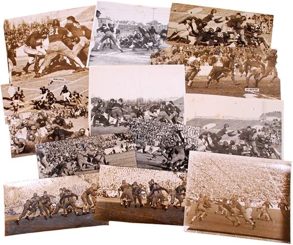 Lots of game action Cal Bears football photos (27) from the 1930's. Many panoramas. Various sizes and conditions, from 8" x 4" to 8 1/2" x 11". GD-EX. Photos of gridiron matches versus Georgia Tech, Idaho, USC and Washington State. Includes complete game charts from Cal vs. USC October, 1931 match-up.