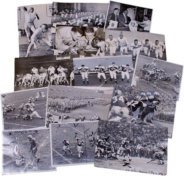 College football photos (70) from the East-West All-Star Game 1950-1958. Sizes vary from 4" x 7" to 8 1/2" x 11". Conditions range from GD-MT. Some key players photographed include Leroy Bolden, Michigan State All-American Halfback who played on the 1952 MSU national championship team. Bolden was also a 1960 charter member of the Dallas Cowboys. Notre Dame All American QB Ralph Guglielmi, and Irish teammates Dan Shannon and Joe Heap are also shown together in a mint 8" x 10" print. California QB Paul Larson, Texas Tackle Buck Lansford and Washington State's Duke Washington, who was the first black football player ever to play at the University of Texas stadium, are also subjects of photos in this fine collection of 1950's college football talent.