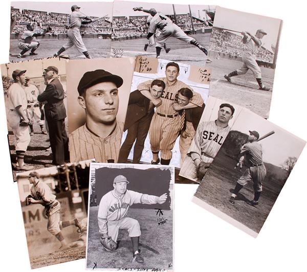 Player manager Dolph Camilli is the subject of this photo collection (10) from the 1920's through 1940's. Dolph was a first baseman and power hitter for two decades in both the Pacific Coast League and Major League. He was named the National League MVP in 1941 after leading the league in both homers and RBI's. His Brooklyn Dodgers won the pennant but lost in five to the NY Yankees in the World Series that year. Photos size from 4" x 8" to 8" x 11". Most are in the VG range with some chips and rough edges. Some have been artfully enhanced. Key photo shows Camilli taking a cut at a pitch as a player-manager for the Pacific Coast League's Oakland Oaks in 1944. Catcher in the picture is LA Angels 16 year old sensation Bill Sarni. Sarni's career and life was cut short when he died of a heart attack as a member of the NY Giants in 1957 at age 29.