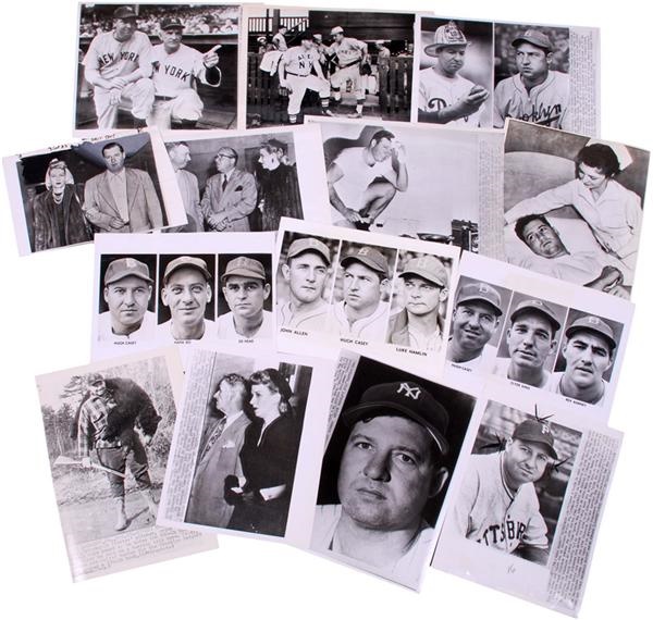 Hugh Casey, Brooklyn Dodger star pitcher is the subject of this collection of news service photographs (15). Sizes range from 7" x 10" to 8" x 11". Conditions range from EX-NRMT. One shows him toting a 200lb black bear, another shows him in a dugout conversation with the great Casey Stengel. His Pacific Coast League playing days in 1945 are highlighted as well. Known as the Fireman, Casey sadly committed suicide in July, 1951.