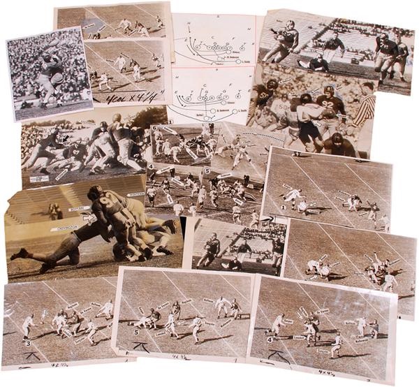 San Francisco Examiner staff photographers captured tons of game action from the 1938 University of California football season in this lot of (22) news photos. The images include some fine examples of photo diagramming as it was done before the digital age, giving great detail on the plays captured by the photographer's cameras. Some additional original SF examiner newspaper art in this lot shows: (3) diagrams from Cal's playbook that season; an (8) photo series called a "Magic Eye camera strip" detailing a play fake the USC Trojans tried unsuccessfully to use against the Bears. The photos measure 5x6" to 9x14" and are in VG to NM condition. Fascinating collection of vintage football photography!