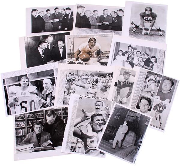 The NFL's first draft pick for 1949 is the subject of this collection of (13) wire photos. Pro Football Hall of Famer, Chuck Bednarik, was selected by the Philadelphia Eagles and was known for his crushing tackles, including one that shortened the career of Giants legendary running back, Frank Gifford. Images of Bednarik dating from 1948 to 1966 include: at 1948 Touchdown Club dinner posed with Conzelman, Lujack, Baugh, Gambino and Tatum; signing his contract with the Eagles in 1949; as the oldest guy at training camp, still looking tough in 1959; turning in his uniform after his last pro game in 1962; pretending to beat Arnie Palmer with a golf club in 1966 -"the only way" he could "beat Palmer". Sized from 4x10" to 9x12", photos range in condition from VG to MT with most on the better end of that scale.