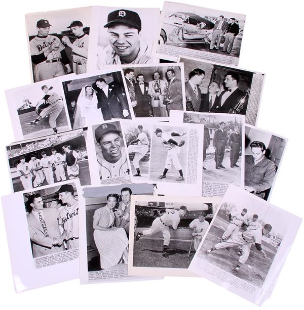 When Detroit Tigers pitcher Art Houtteman made his baseball debut in 1945, he was the youngest player in the American League at just 17 years old. Here is a fascinating collection of (27) wire photos covering his solid career commencing with his rookie season through his final trade to the Orioles in 1957. Images in-between include: AP coverage of the 1949 car accident that fractured his skull; 1950 as a new Army recruit; 1951 with his wife welcoming their baby daughter; his trade to the Indians in 1953. Sized from 3x8" to 8x12", photos range in condition from VG to MT with most on the better end of that range.
