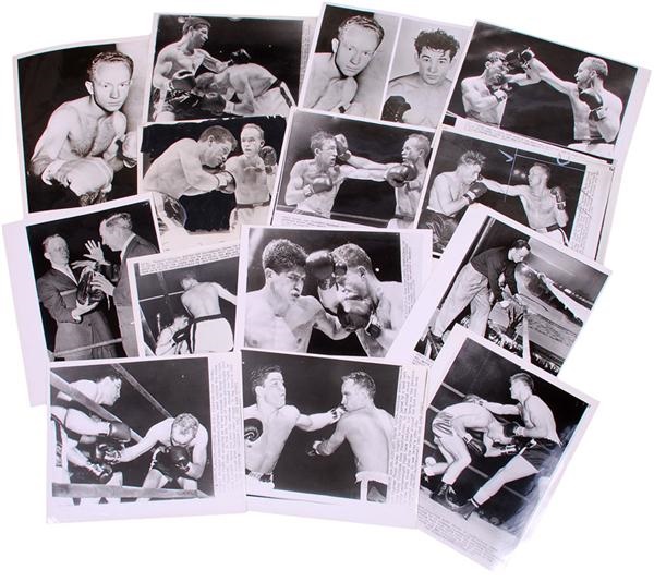 Welterweight fighter and member of the Boxing Hall of Fame, Chuck Davey, is the subject of this (33) piece collection of wire and news service photographs from the mid 1950's. Dating from 1952 to 1954, the images capture Davey fighting against some of the great boxers of the day. Some image highlights include: 1952 photos with Rocky Graziano and Carmen Basilio; (2) fine portraits (8x10 and 5x7) circa 1953. Condition of the photos range from VG to MT with many on the better end of that range.