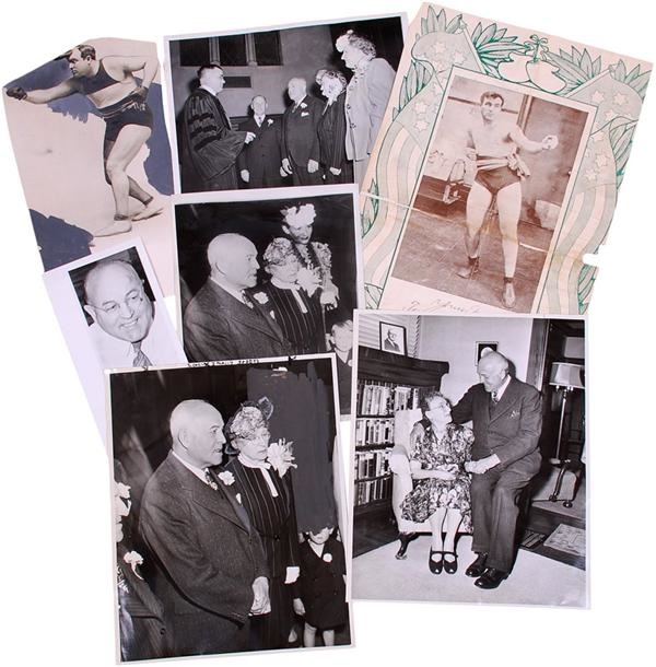 Tommy Burns held the world heavyweight title between 1906 and 1908, defending it a remarkable eleven times in those two years. He ultimately lost his title to Jack Johnson after becoming the first fighter willing to defend his heavyweight title against a black man. These (7) news service and SF examiner staff photos contain: a very early (circa 1910's) fight posed photo of Burns; a collectable 9x14" poster of Burns, also circa 1910's (G/VG); several photos reporting his twilight marriage to Nellie Venderlip in 1946. Besides the poster, photos range in condition from EX to MT. Sized from 4x8" to 9x14".