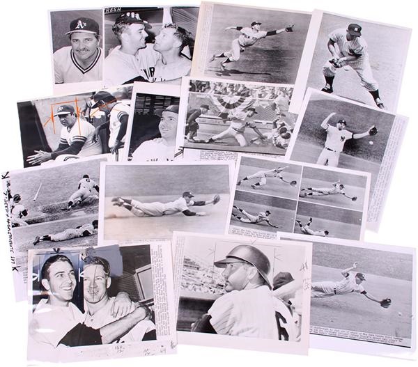 Wire photo collection (22) featuring 1960's era New York Yankees third baseman Clete Boyer. Features wire photo of Boyer leaping in vain for a hit by Saint Louis Cardinals great Curt Flood from game six, 1964 World Series. Also includes: mint photo of Clete with Whitey Ford celebrating after the game 1 World Series victory over the San Francisco Giants; Boyer after joining the Pacific Coast League Hawaii Islanders; earliest photo from 1957 showing a young Boyer counting the days for his trade from Kansas City to the Yankees to take effect; latest photo from 1987 as a coach with the Oakland A's. Sizes range from 2" x 4" to 8" x 11". Condition ranges from VG to Mint with many in the excellent to near mint range.