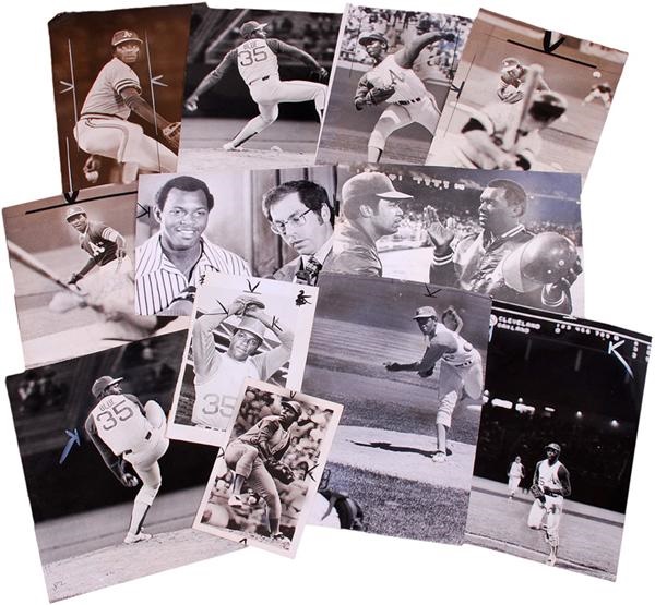 Great collection of (22) San Francisco Examiner staff photos capturing the American League's 1971 Cy Young award winner and Oakland A's favorite, Vida Blue. Many oversized images in this lot that includes several nice photos of Blue on the mound, involved in charity events and more. Sized from 5x7 to 8x12" photos range in condition from VG to EX and have original news clippings affixed to versos.