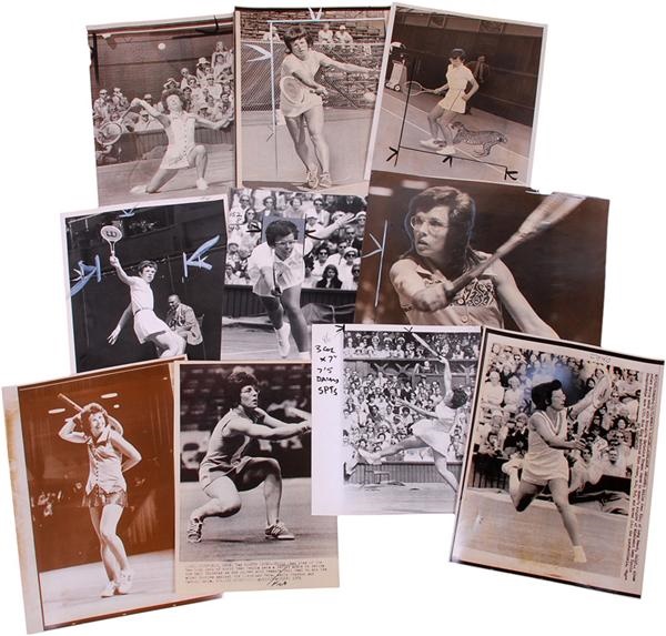 Amazing collection of original wire photos (110) of tennis superstar Billie Jean King. Sizes range from 4" x 8" to 8 1/2 x 11 and ranging from VG-NRMT in condition. Photos include a juicy one from 1973 depicting King sitting on on the shoulder of now-infamous runningback, O.J. Simpson. Another from 1975 taken in London of King dancing with Arthur Ashe. Also included is a photo of King receiving the "Battle of the Sexes" trophy from George Forman for defeating Bobby Riggs 6-4; 6-3; 6-3 in 1975. Many shots of her holding grand slam winners trophys; one with Chris Evert looking up "longingly" after losing to King at Wimbledon 6-0, 7-5 in 1973.
