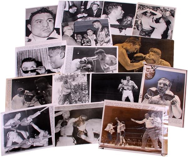 Collection of 1960's original boxing wire photos (30) including boxing greats Joe Louis, Floyd Patterson and Canadian champ George Chuvalo. Photos range from VG to NRMT. A few are art enhanced as was customary in that era. One photo shows Floyd Patterson and Geore Chuvalo weighing in before their bout in February, 1965. Another shows Floyd Patterson consoling Chuvalo whose right eye is swollen and closing up at the end of their 12-round fight at Madison Square Garden February 1, 1965. Another shows Chuvalo having his head gear adjusted as Joe Louis looks on during training for his upcoming bout versus Cassius Clay, March 1966. Joe Louis joined the Chuvalo camp to help with "secret strategy" as Chuvalo prepped to fight Cassius Clay. Clay went on to win a unanimous decision March 29, 1966.