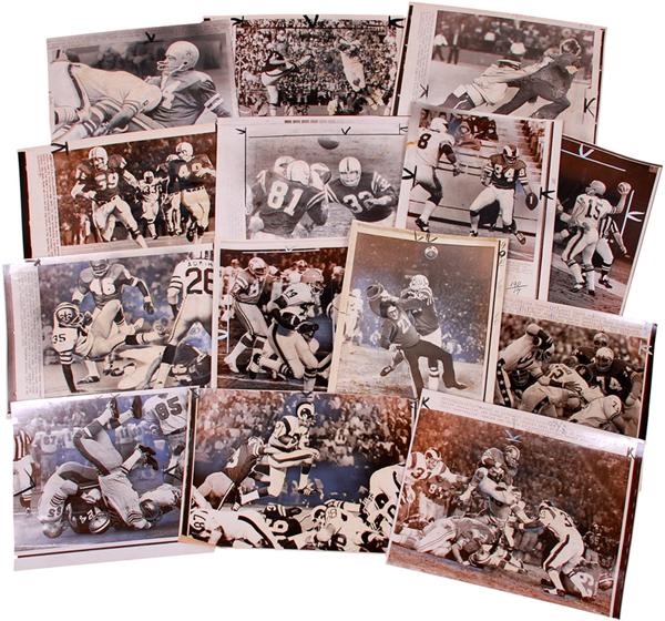 Great collection of NFL wire photos including shots of Green Bay QB Bart Starr, Dallas QB Roger Staubach, Patriots QB Steve Grogan and lineman John Hanah. Sizes range from 6" x 8" to 8 1/2" x 11". Also includes game action photos of Walter Payton, NY Giants' Hary Carson, OJ Simpson and Johnny Unitas among many others.