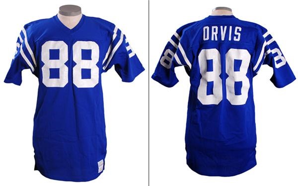 Game worn football jersey belonging to #88 Herb Orvis of the Baltimore Colts. Orvis was a defensive tackle and a first round draft pick in 1972 out of the University of Colorado. Lot comes with a mint Topps single signed card.