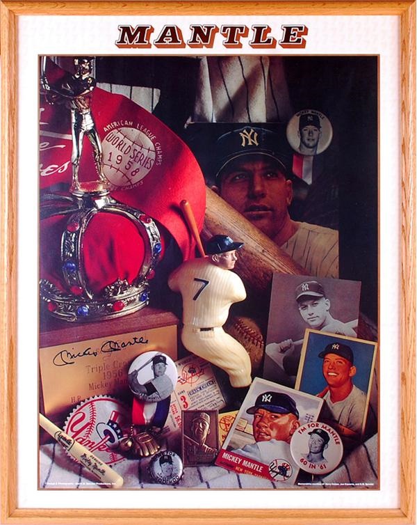 Classic Mickey Mantle baseball memorabilia is artfully displayed in this fine photo print by Davis Spindel. The print has been mint signed by Mantle in blue Sharpie and comes with a LOA from James Spence Authentications. Framed to 23 x 29".