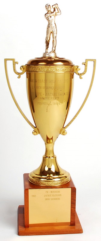 Trophy from 1965 Gold Coast Golf Capers charity March of Dimes golf tournament. Hosted and played in by Jackie Gleason and Bob Hope. Branded as a "Grudge Match" between Gleason and Hope. Jackie Gleason was a co-winner with Doug Sanders that year. Trophy is 23" in height. Golfer on top of trophy is missing club. Otherwise trophy is in good condition.