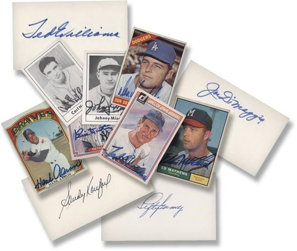 Includes Trading cards: 1966 Drysdale, 1960 Groat, 1968 AS Brooks Robinson, 1972 Hank Aaron, 1961 Ed Mathews, 1983 Donruss HOF Feller, Kiner and Dickey. 1978 Grandslam Mize and Hubbell. 3 x 5 Index cards: Joe Dimaggio, Chas Gehringer, Sandy Koufax, Ed Mathews, Duke Snider (2), Lefty Gomez, Carl Hubbell, Yogi Berra, Ralph Kiner, Monte Irvin. Finally there is a Bob Feller signed postcard. All have bold ink signatures.