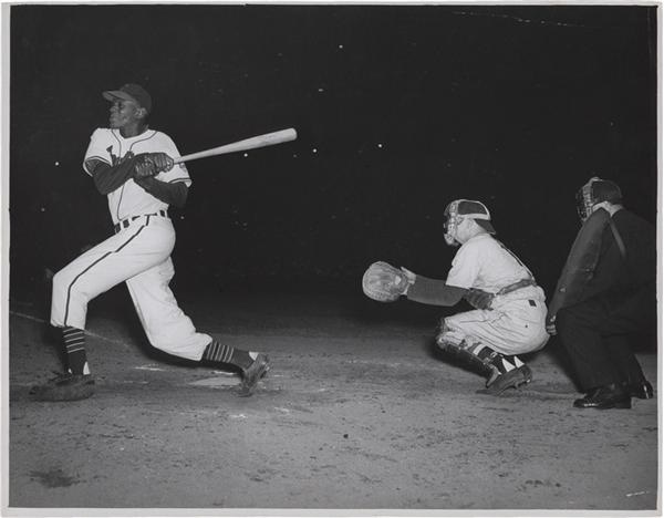 Original photo of Satchel Paige during his 2 season tenure with the Cleveland Indians in 1948 and 1949. Paige was known for his "Hesitation Pitch" which was ultimately ruled to be a balk and illegal. Chicago Cubs broadcaster Jack Brickhouse is quoted as saying jokingly that Paige "threw a lot of pitches that were not quite "legal" and not quite '"llegal". Photo is horizontal in format, 10" x 8", and is in EX-MT condition with just a few creases. Paige was the first black pitcher in the American League and the seventh in the big leagues overall.
