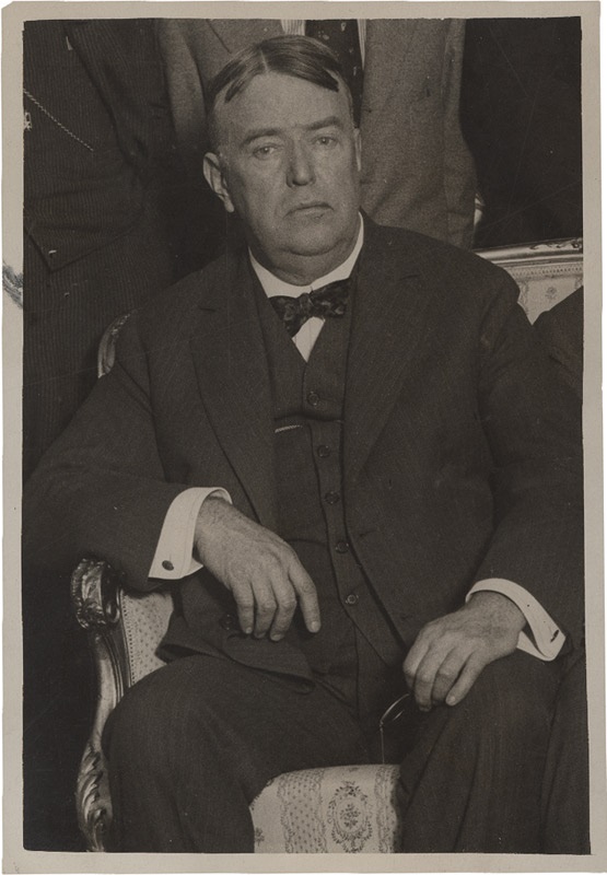 Original 1924 photo of Ban Johnson, founding president of the American League. He was nicknamed "The Czar of Baseball" and was elected to the Hall of Fame in 1937. He is renowned for banning the "Black Sox", eight members of the Chicago White Sox who conspired with gamblers to throw games. 5" x 7" photo is EX with very small chip upper left corner, black scuff mark left side border. Johnson is credited with declaring the upstart American League as a "Major League" in 1901 thus initiating head to head competition with the existing National League and the first "World Series" in 1903.