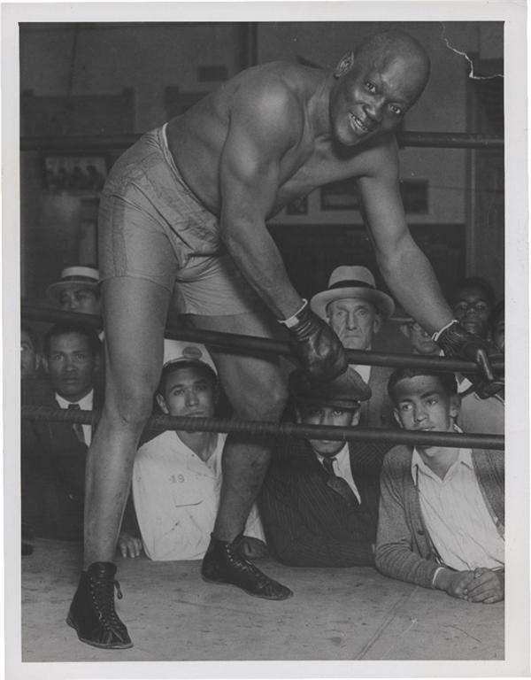 Photo of Jack Johnson, "The Galveston Giant", the first black heavyweight champion. It is 7" x 9", with some corner and edge damage and creases. Photo from the 1930's but was printed in the 1950's.