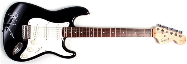 Fender Strat Guitar, signed by rock legend Sting of the currently touring 80's band The Police. Guitar is 40" with a black body and white pick guard. Sting's mint signature is near the base of the guitar in silver paint pen.