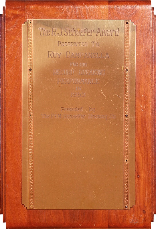 This award was given by the F. & M. Shaefer Brewing Company in 1953 to Roy Campanella of the Brooklyn Dodgers for his record breaking RBI performance. The 10" x 15" plaque is missing some of the screws that hold the decorative brass columns onto the wood. Plaque is in overall in EX condition.