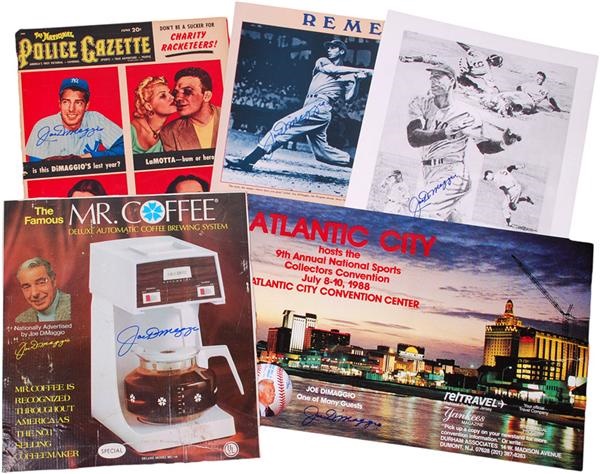 Collection of Joe DiMaggio signed prints and posters. Includes an Amore signed and numbered illustration of DiMaggio, a signed Mr. Coffee box panel and a scribed June, 1951 “National Police Gazette Magazine” with DiMaggio and Groucho Marks on the cover. All items are in EX-NRMT condition.
