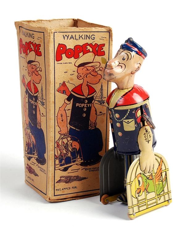 Walking Popeye tin wind-up toy with box from 1932. Box is missing top. Made by Louis Marx & Co., New York. Depression era toy. Winding mechanism functions. Popeye carrying parrot in cage. 9" in height. Piece has some minor scratches but is otherise in very good condition.